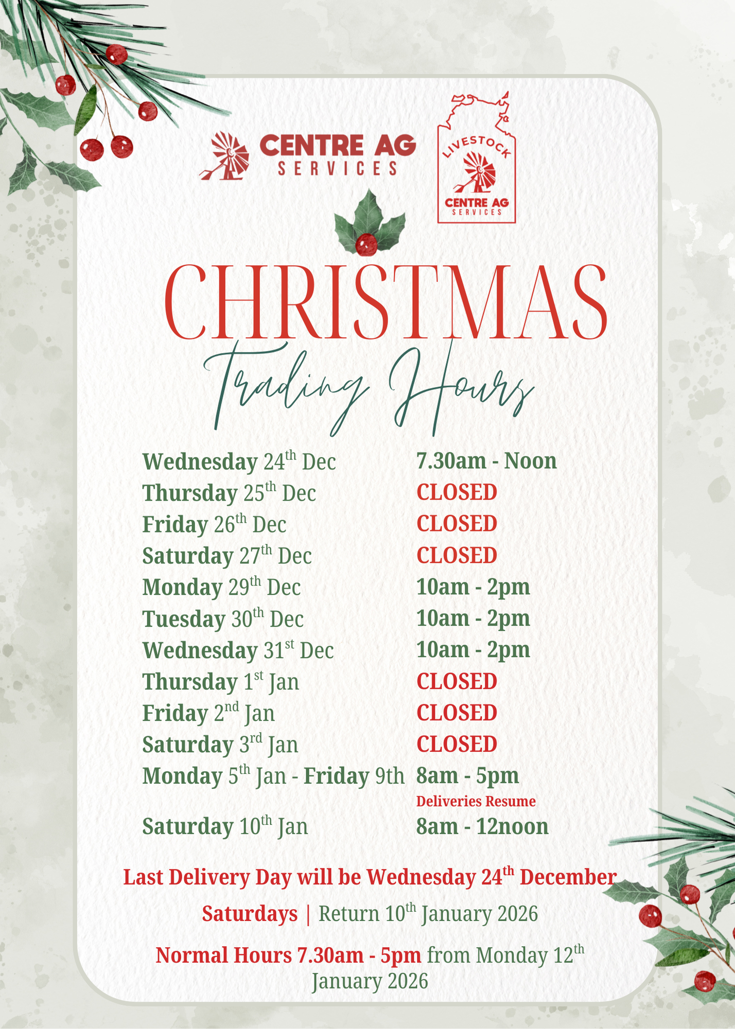 Why not pop in this Saturday 8am - 12noon or come see us before 12noon on Christmas Eve to finish off your Christmas Shopping!